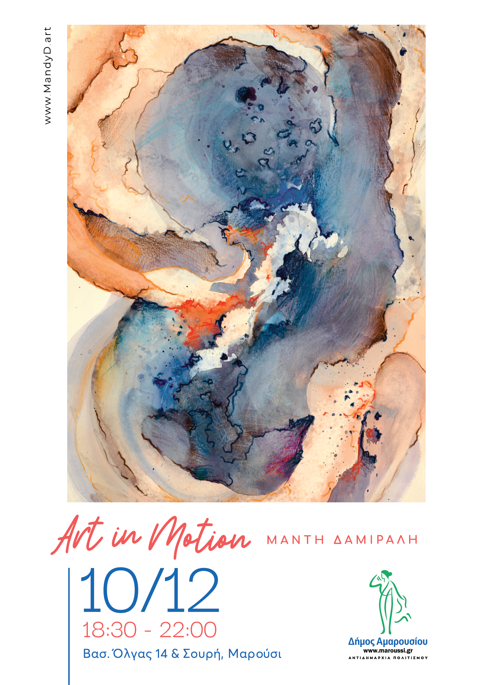 Στην έκθεση “ART in MOTION”, παρουσιάζει έργα που συνδυάζουν την ένταση του χρώματος με τη διαφάνεια και τη ρευστότητα της υδατογραφίας, αποκαλύπτοντας έναν φωτεινό κόσμο όπου το συναίσθημα και η κίνηση συνυπάρχουν αρμονικά.